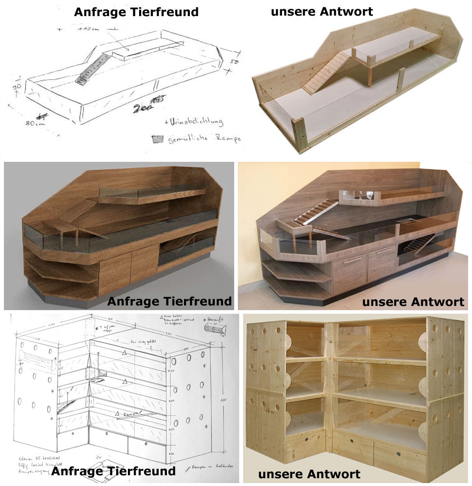 Sie haben nicht das Passende gefunden? Kein Problem! Wir passen Ihre Behausung nach Ihren Wünschen an. Ob Maßänderungen, Erweiterungen oder die Umsetzung Ihrer eigenen Ideen, wir setzen alles um. Auch bei der farblichen Gestaltung sind Ihrer Kreativität kaum Grenzen gesetzt. Schicken Sie uns einfach Ihre Skizze oder Entwurf, und wir planen zusammen das perfekte Tiergehege für Ihre Lieblinge.